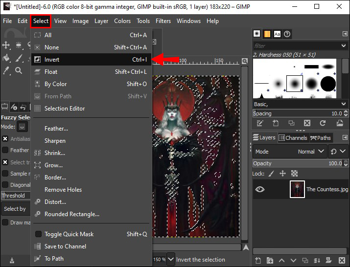 - To delete the background, click “Select” in the upper menu and invert the selection. Click “Delete” to remove it.