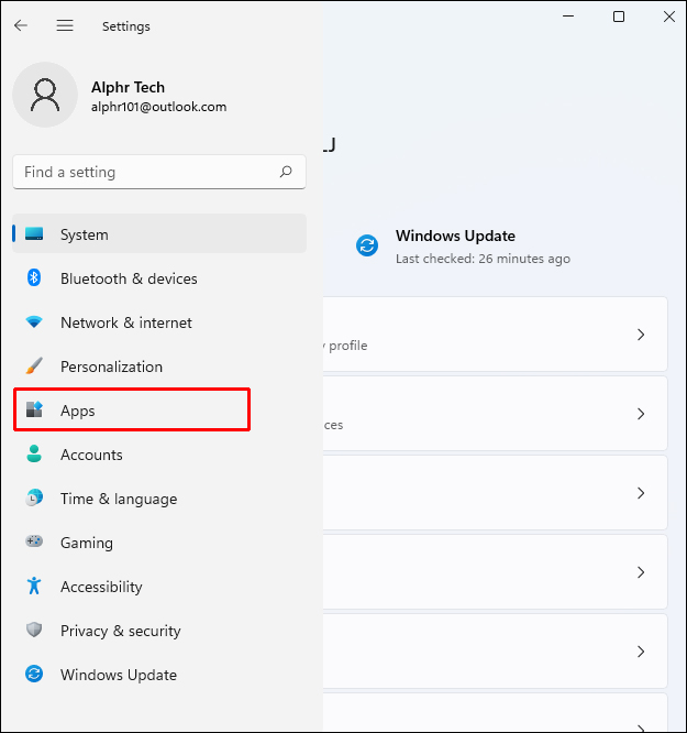 - After the Settings box is open, select “Apps” located in the right-hand menu.