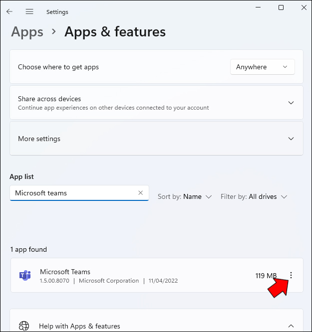 - On the main screen, pick “Apps & features.” Beneath the “Apps” section, type in Microsoft Teams to find it in the search results.