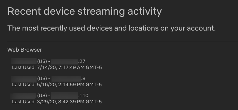 If you’d like to see what devices are currently using your Netflix account you can see a list of the IP addresses and locations that have accessed your account.