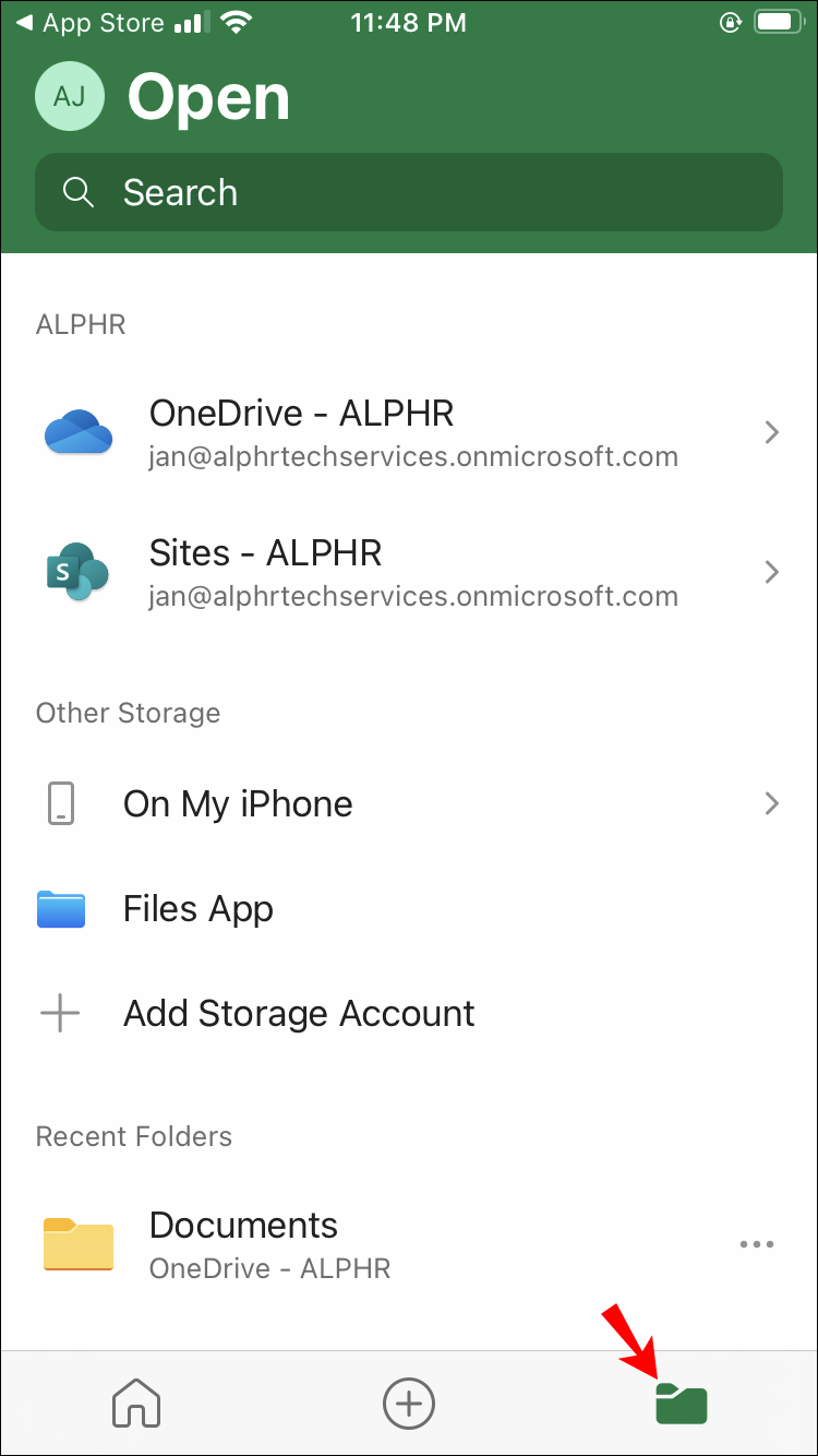 Note: If you are immediately taken to a different document (the last one you viewed), you need to tap the “File” tab first. Afterward, go to the “Open” section on the sidebar. - Select “OneDrive – Personal” on the list of options.