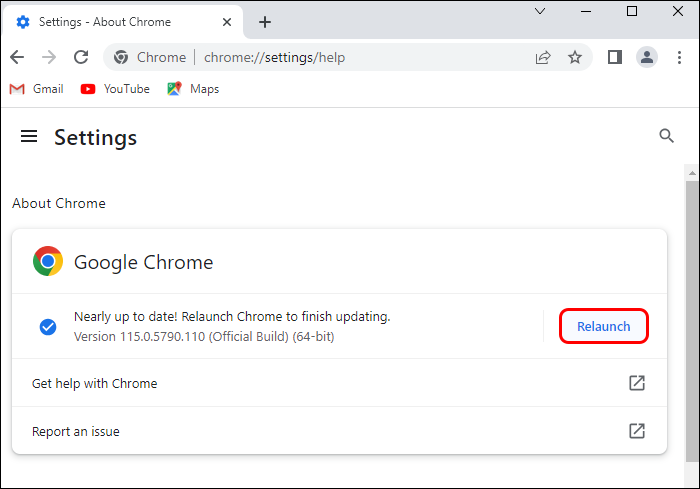 - Click “Update Google Chrome” or “Relaunch,” depending on your Chrome version.