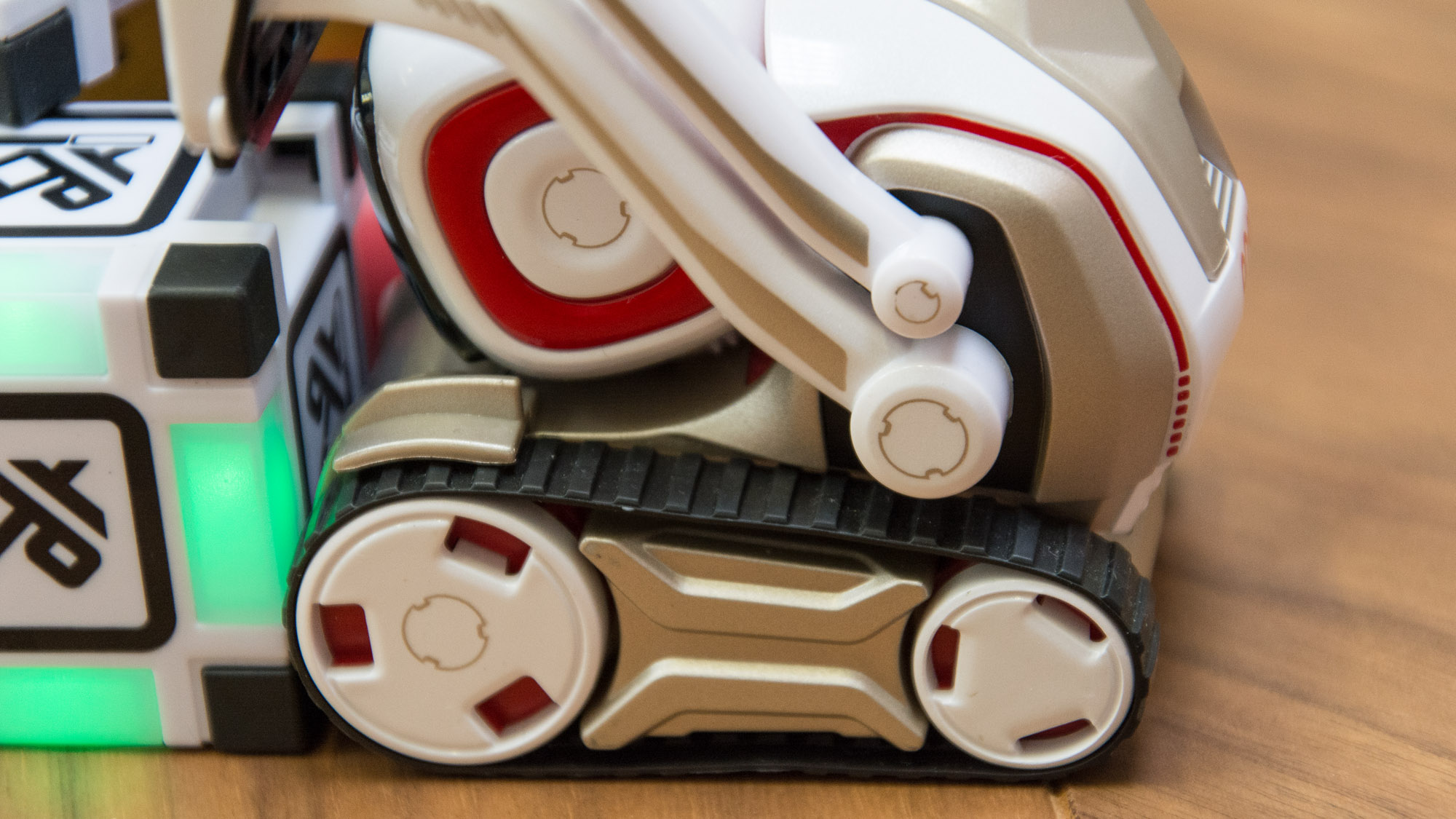 Its “face” is a small LED screen that lights up when Cozmo is awake and shows two blocks of blue light that act as the robot’s “eyes”. Its expressions – from joy and sadness through anger – are all effortlessly portrayed by these eyes, and the sounds Cozmo makes adds to its appeal. A small sensor at the bottom of this screen looks like an open mouth, Cozmo’s “arms” resemble a forklift and are used to act out frustrations or joy, and the robot runs on two black rubber treads that can be swapped out for different colours including red, blue and yellow. Cozmo itself is white with red and gold trims.
