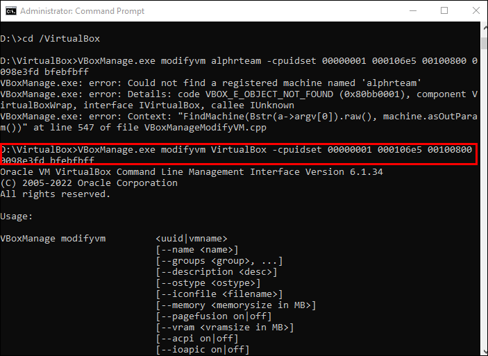VBoxManage.exe modifyvm “virtual machine name” –cpuidset 00000001 000106e5 00100800 0098e3fd bfebfbff