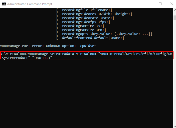 VBoxManage setextradata “virtual machine name” “VBoxInternal/Devices/efi/0/Config/DmiSystemProduct” “iMac11,3”