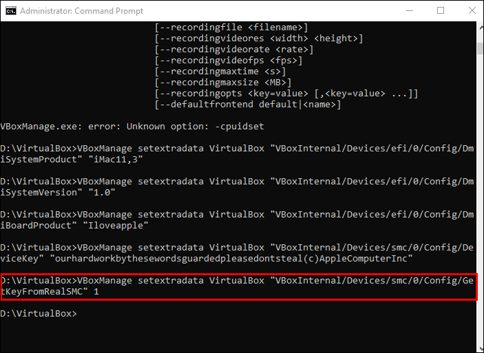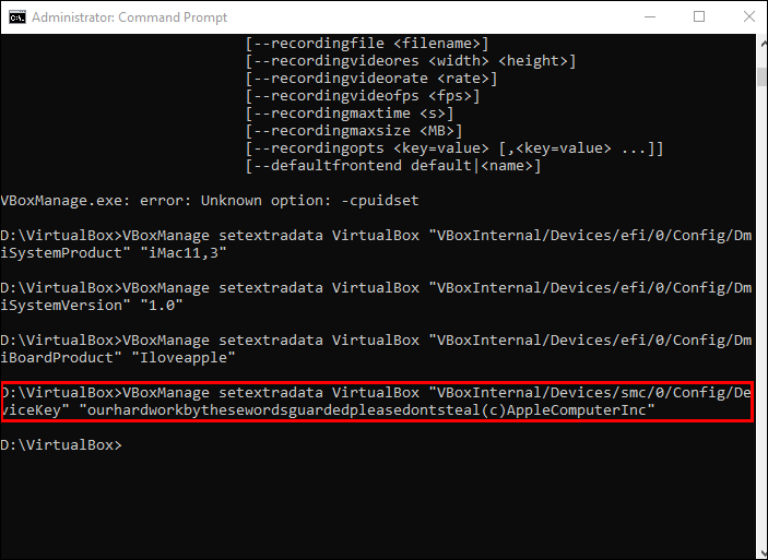 VBoxManage setextradata “virtual machine name” “VBoxInternal/Devices/efi/0/Config/DmiBoardProduct” “Iloveapple”