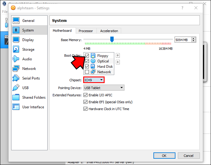- In the “Motherboard” tab, uncheck “Floppy” from the Boot Order list and select “ICH9” for your chipset.