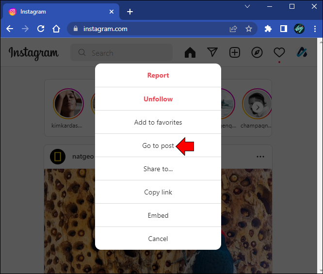 - Click on the three-dotted menu, then select “Go to post.”