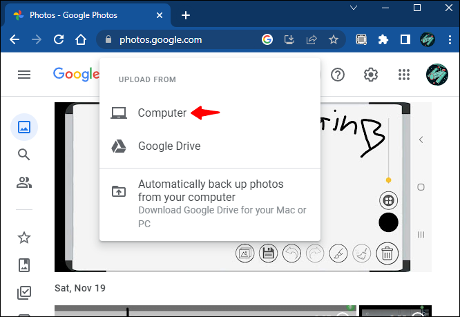 - Visit Google Photos and click the “Upload” icon.