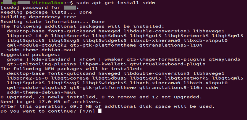 Again, enter your password when prompted and then ‘y‘ to confirm the installation. The same display manager window will appear after installation and prompt you to select your choice.