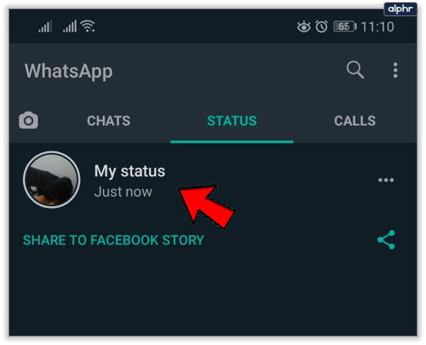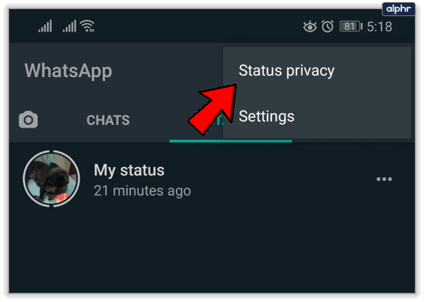 - Go to the Status screen in WhatsApp and tap the three dot menu icon to open your status list.