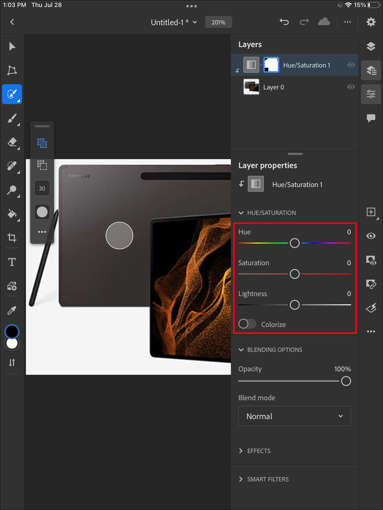 The Photoshop app for iPad doesn’t have all the selection tools available on the PC version of this popular software. Still, there is an excellent tool you can use to select a color and change it.