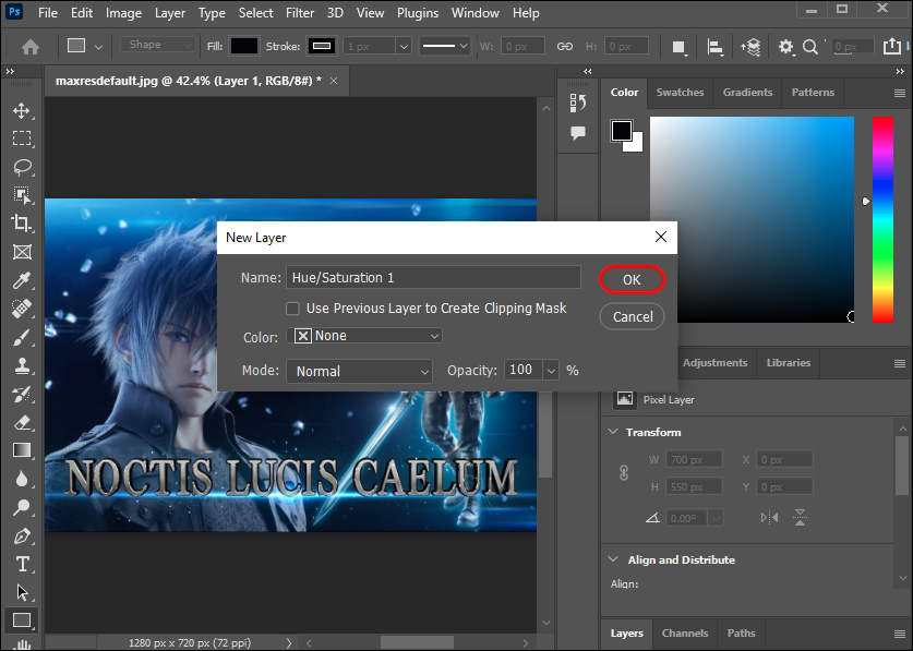 - Adjust the “Saturation” slider to change the color’s intensity.