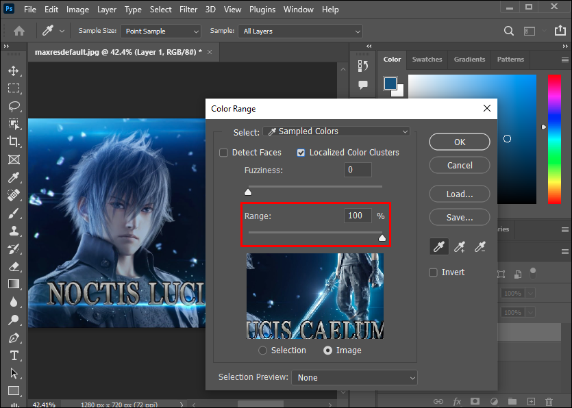 - In the “Color Range” panel, drag the “Fuzziness” slider to 0.