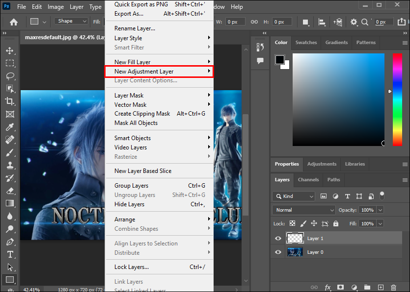 - Click on the “New Fill or Adjustment Layer” icon in the bottom-right corner.
