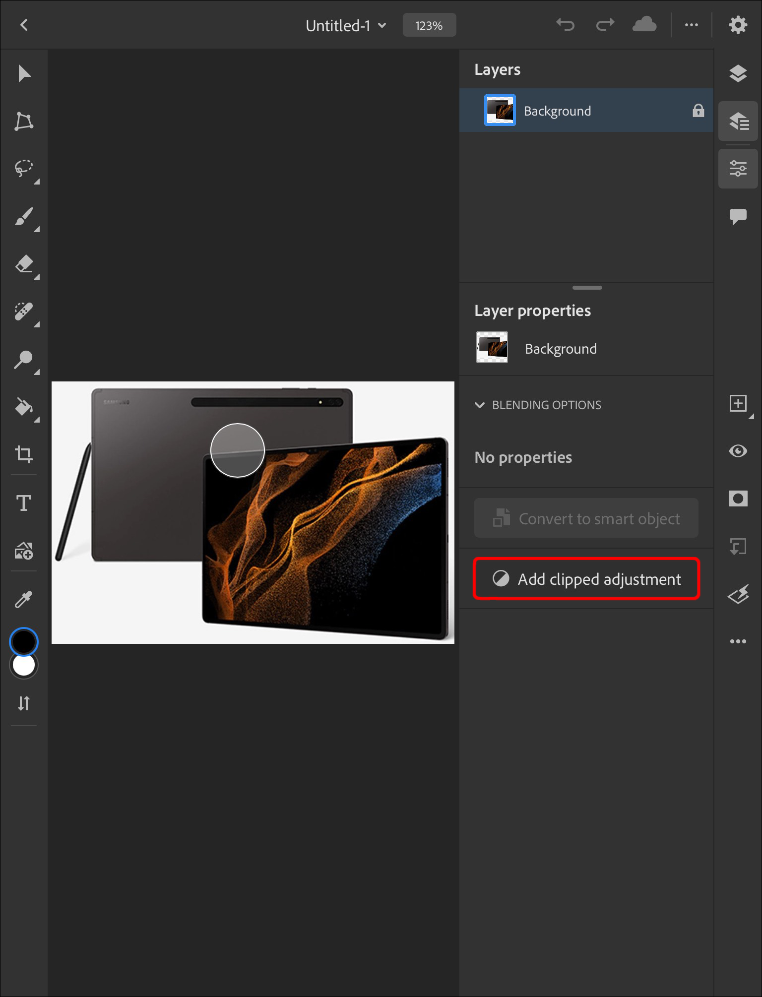 - Tap the “Add” clipped adjustment button within the “Layer Properties” panel on the right.