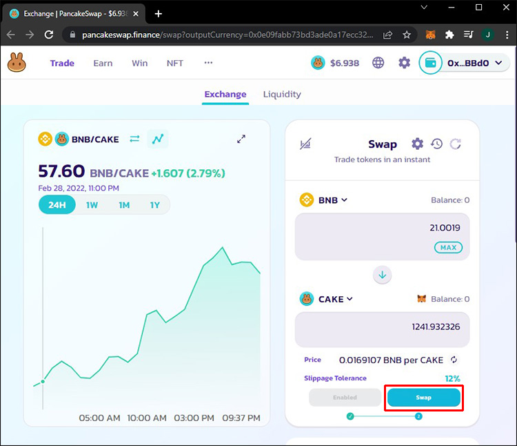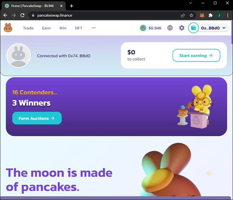 - Open your browser and go to PancakeSwap. Log in to your account.