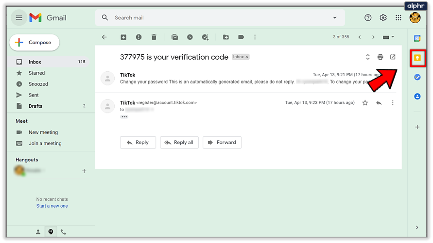 - Click on the Keep icon in the far right of the email screen. It’s a white lightbulb with a yellow background.