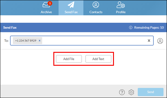 - To add the documents you wish to fax, either select the “Add File” button or add text by selecting “Add Text.”
