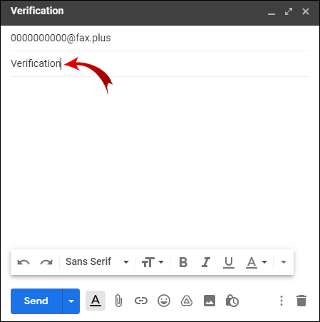 - In the “To” field enter the recipient’s fax number, (country code + area code + fax number); then after the “@” symbol, type “fax.plus” e.g. 0000000000@fax.plus.