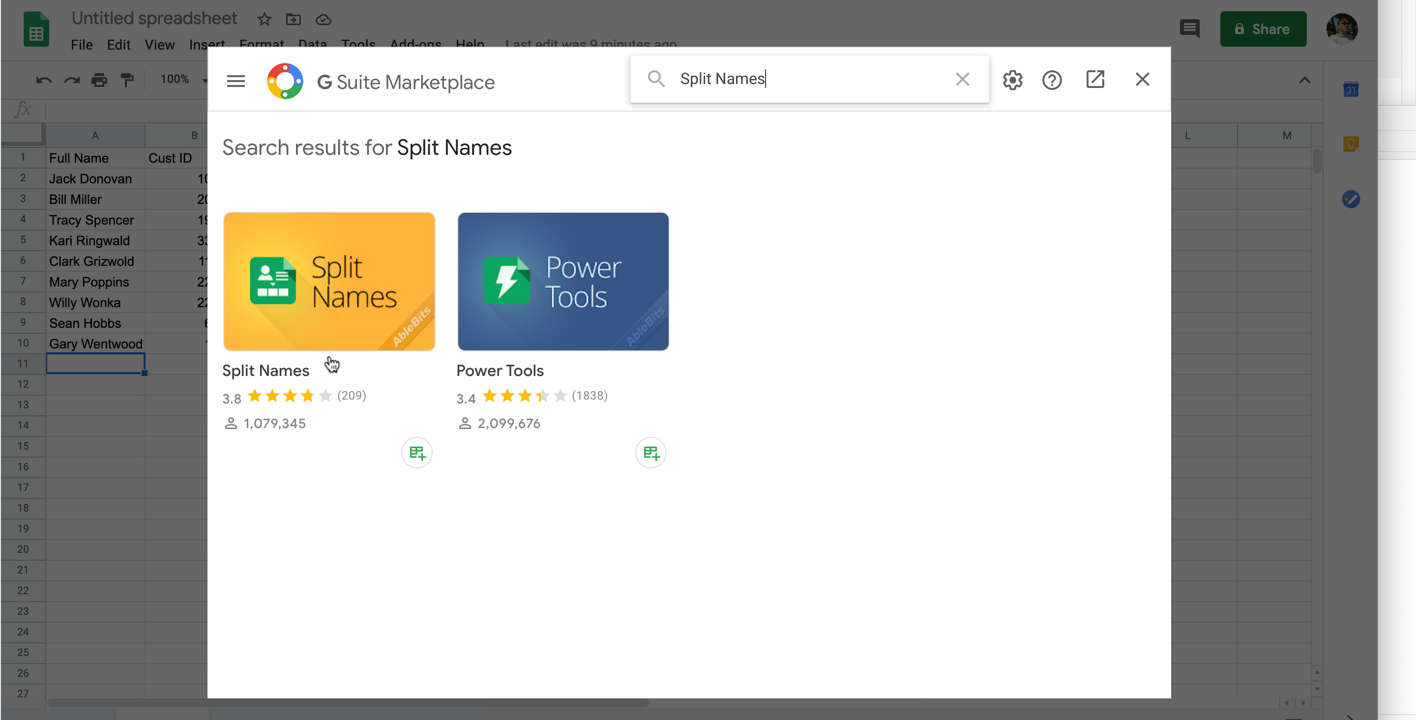 If you need middle names that DON’T mess up cell alignment, installing the Split Names add-on might be more convenient. The extension isn’t free, but it’s relatively affordable, and it does include a 30-day trial period. Follow these steps to install Split Names.