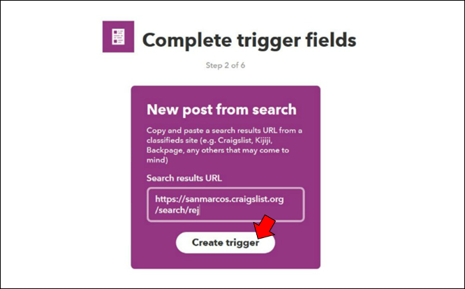 - Paste the URL into the box on the IFTTT page and press “Create trigger.”
