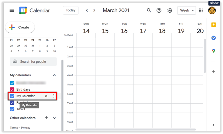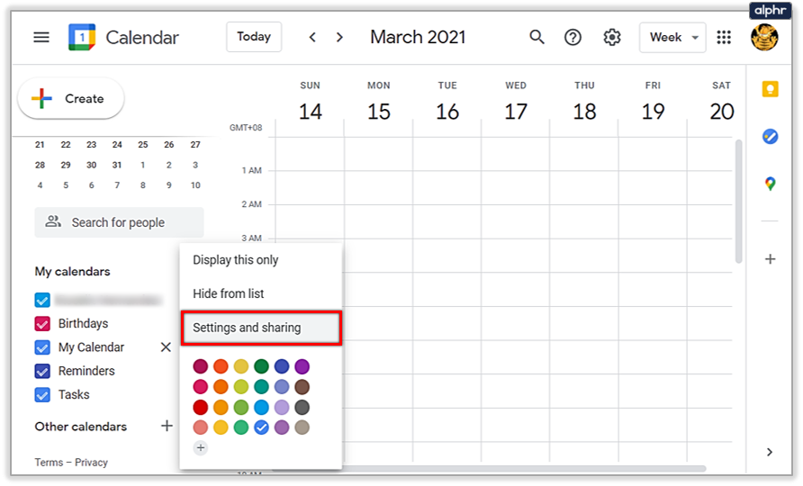 - Inside your Google Calendar, there’s a list of calendars called “My calendars” to the left. Hover with your mouse over the calendar you want to share. Three dots should appear next to it. Click on those.