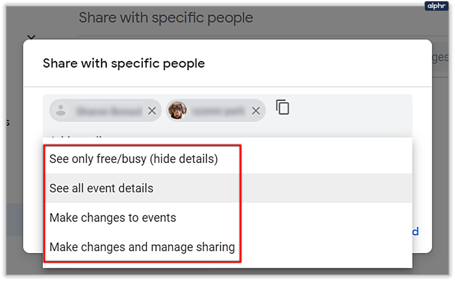 - A Share with specific people popup window will appear. It requests that you enter an email or a name straight away, while also suggesting some contacts you’ve had an exchange with. Google only identifies the names of users who have included Calendar in their Google account.