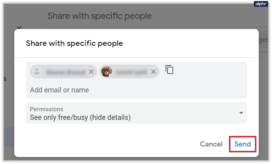 - Click the blue Send button in the bottom right corner of this window. It will close, returning you to your calendar settings. It will also add the people you invited to view or access your calendar.