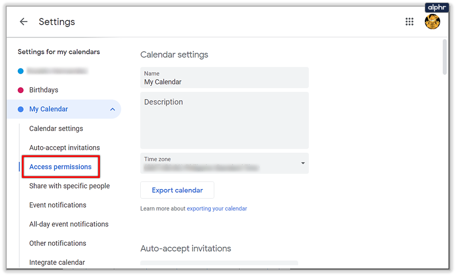 - Within the Calendar Settings menu, click on Access permissions. You can either scroll down until you find it or use the sidebar to the left for easier access.