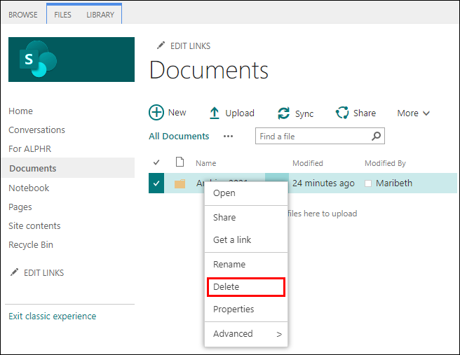 To delete a SharePoint folder using the Classic version:
