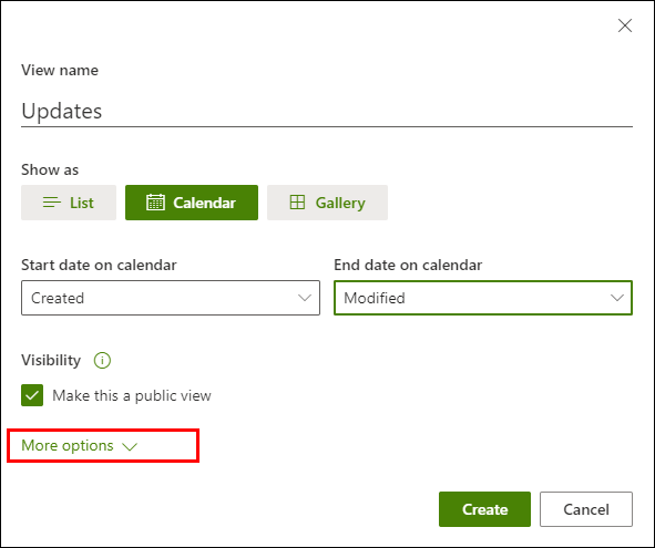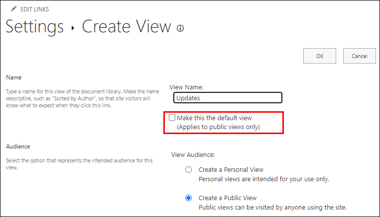 · If the “Create a Public view” option is disabled, then you’d need to get permissions to create a public view for that list or library.
