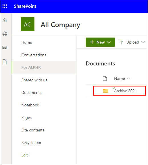 - Your new folder will now be visible in the document library.