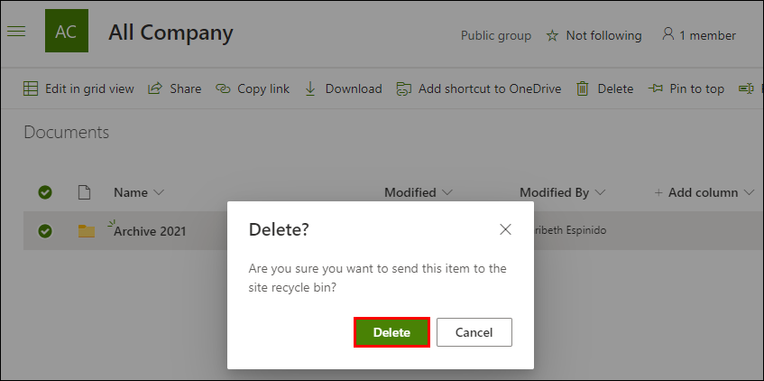 To delete a SharePoint folder using the Modern version: