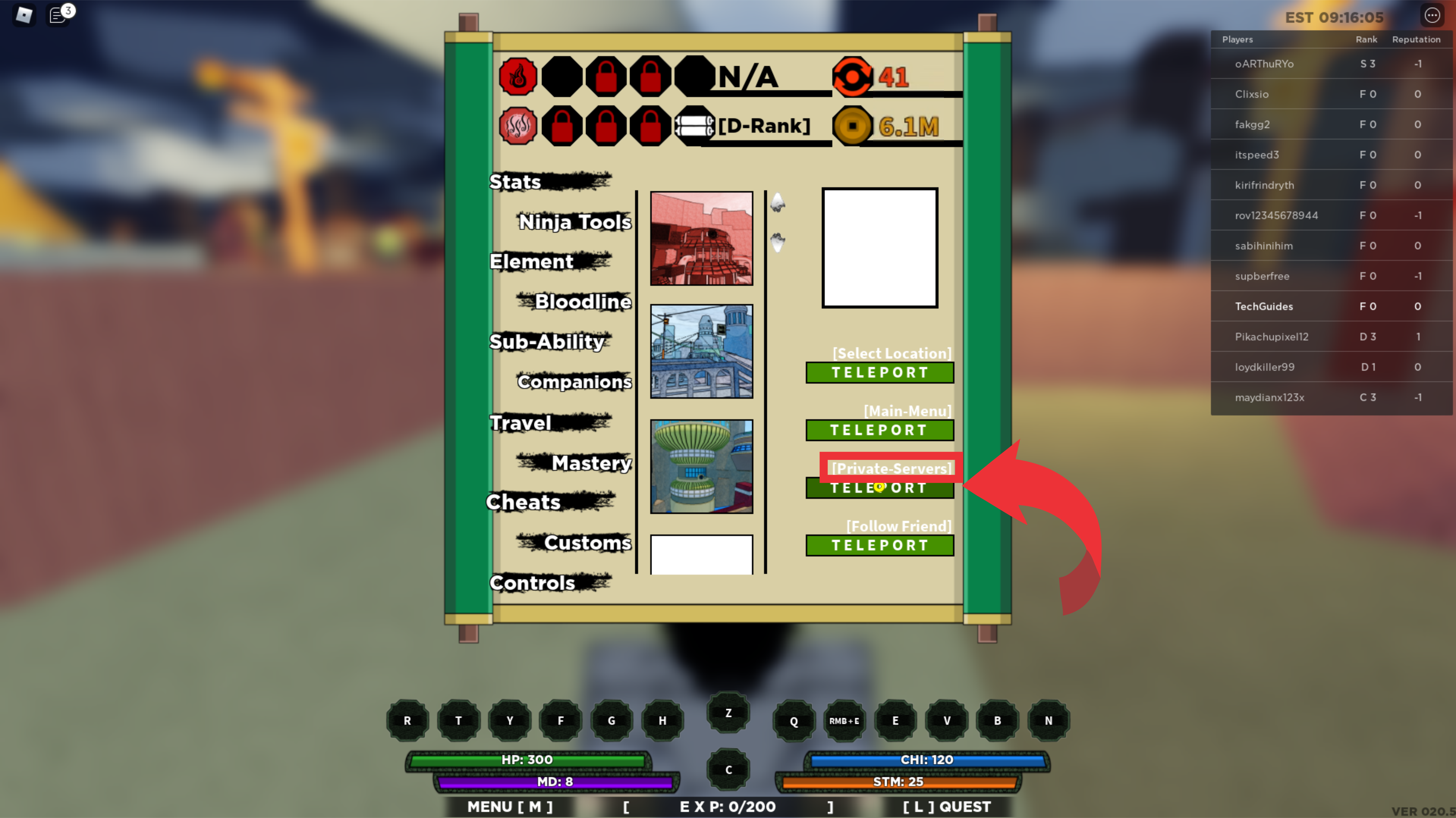 - Look at the TELEPORT buttons on the right. Find the one that says [Private Servers].