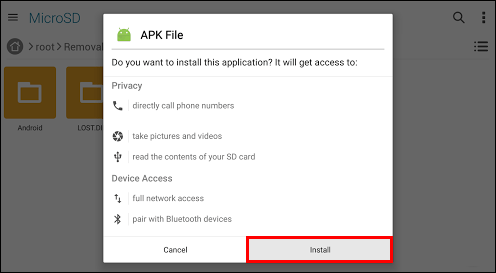 - Once it’s transferred, navigate to your file manager app and install the APK by clicking on it.
