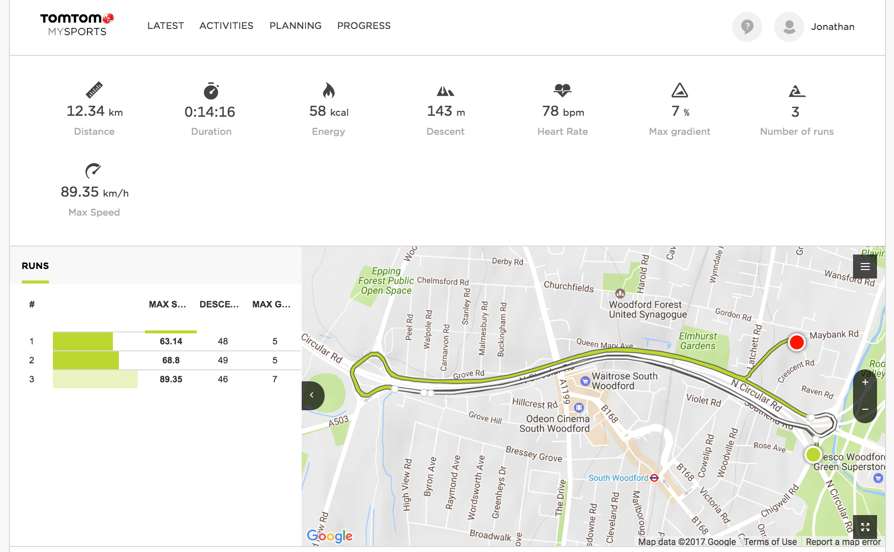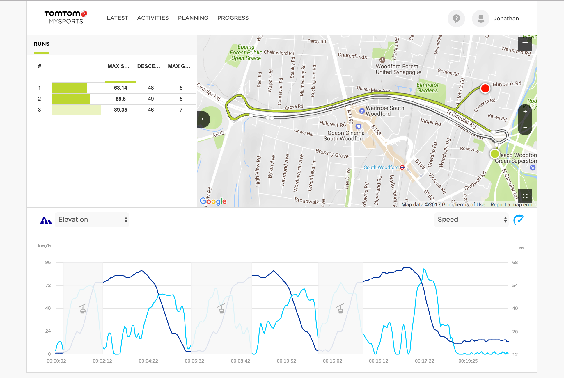 [gallery:7]Next, I got into the car and attempted to simulate a ski run along the A406. This isn’t as mad as it sounds. Driving up and down the same long, straight gentle stretch of hill is quite close to skiing a short blue run at speed, and this seemed to trigger the run-detection mode successfully. It detected on the drive back up the hill that I wasn’t “skiing” anymore, popped up a short summary of my “run” and logged the next two runs in the same way.