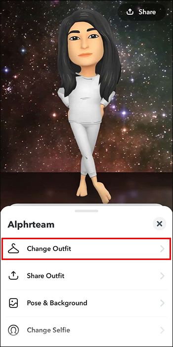 - Select the clothing hanger icon or “Change Outfit.” This will take you to the Outfit page, where you can browse and choose different outfits for your 3D Bitmoji avatar.