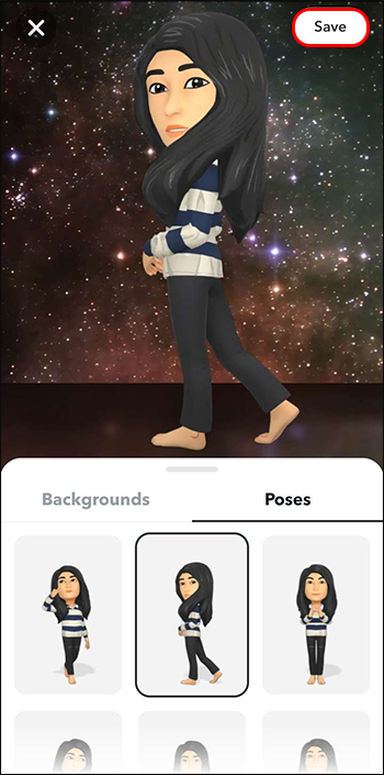 - Tap the “Poses” tab and you’ll find many different poses you can apply to your 3D Bitmoji. Pick the pose you desire and hit “Save.”