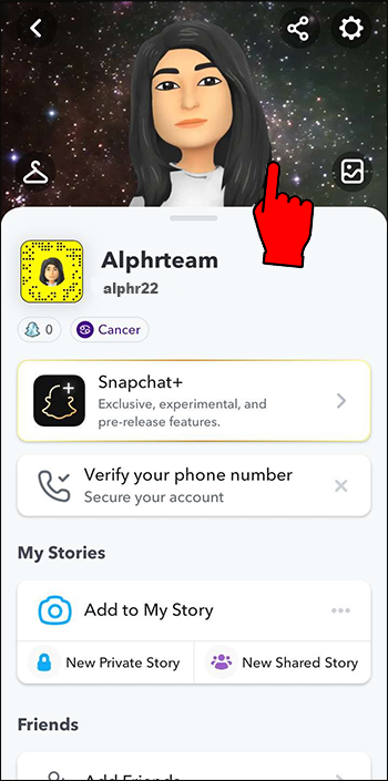 - Press on your Bitmoji avatar or profile icon in the page’s upper-left corner.