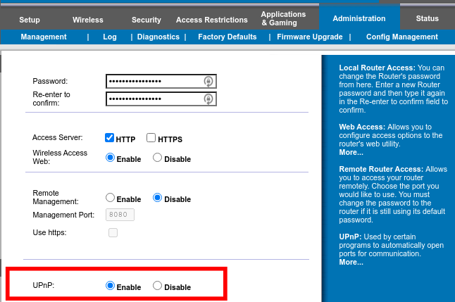 - Look for a setting that allows you to enable Universal Plug and Play (UPnP). You can generally find this under a section called Administration. If you don’t have an administration tab, look around, as there will be a UPnP setting somewhere.