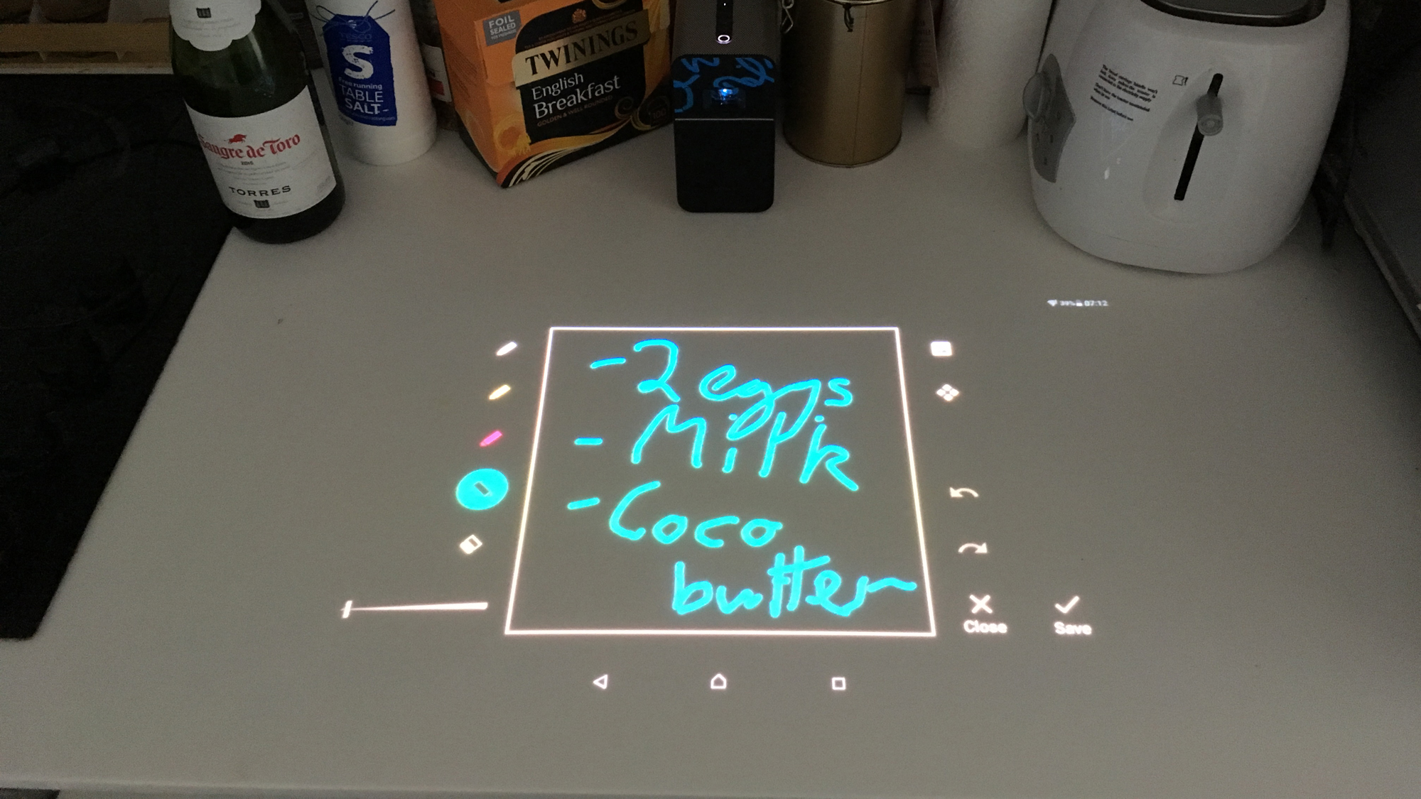 Sitting on a kitchen surface, shifting between online recipes, video messages and YouTube clips is when the Xperia Touch makes the most sense. Plugged into the mains and tucked beside the toaster, the device makes for a handy mini-projector, and the touchscreen’s sensitivity is adequate enough for swiping between apps while cooking. As you’re only dealing with the kitchen surface, it doesn’t matter if you spill a drop of wine over the “screen”, or if your fingers are wet with chicken grease. Want to make way for the roast potatoes? Just move the projector and it will automatically refocus its display.
