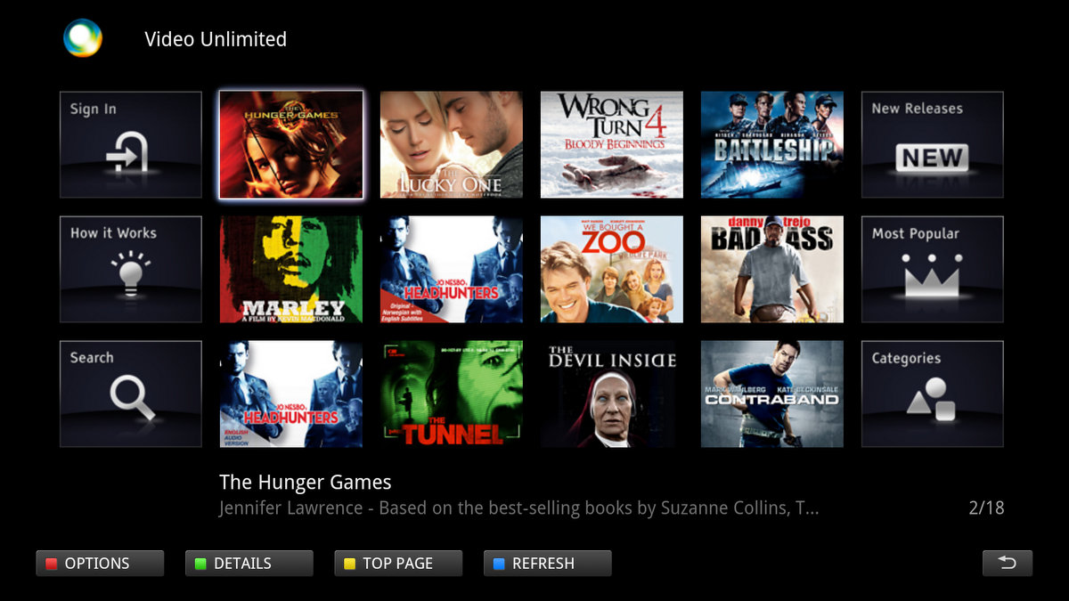 The row of apps displays a clock and Android notifications on the left, and links to live TV (via the HDMI input), the Play store, Chrome, plus YouTube and Sony Entertainment apps. You can sign in and buy music and SD/HD movies (or rent them) through this portal in much the same way that you can on Sony’s Android tablets.