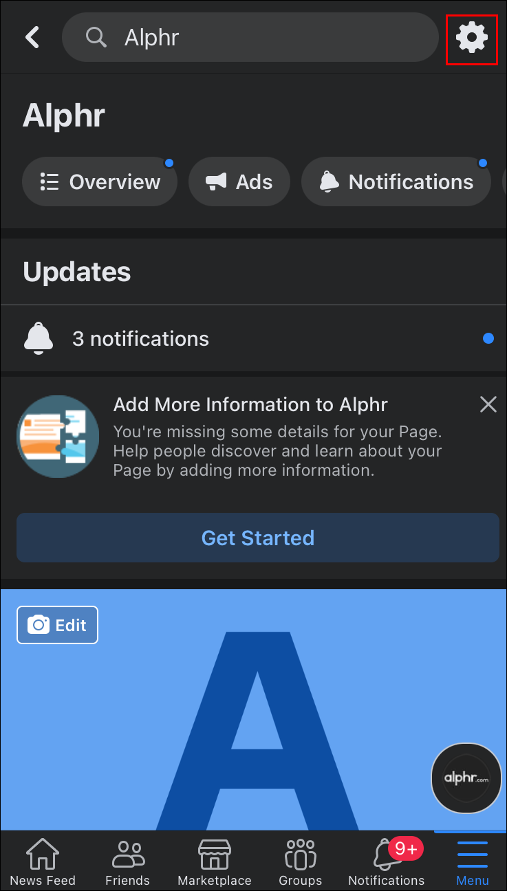 - Navigate to your page and tap the “gear icon” in the top right corner to open the settings section.