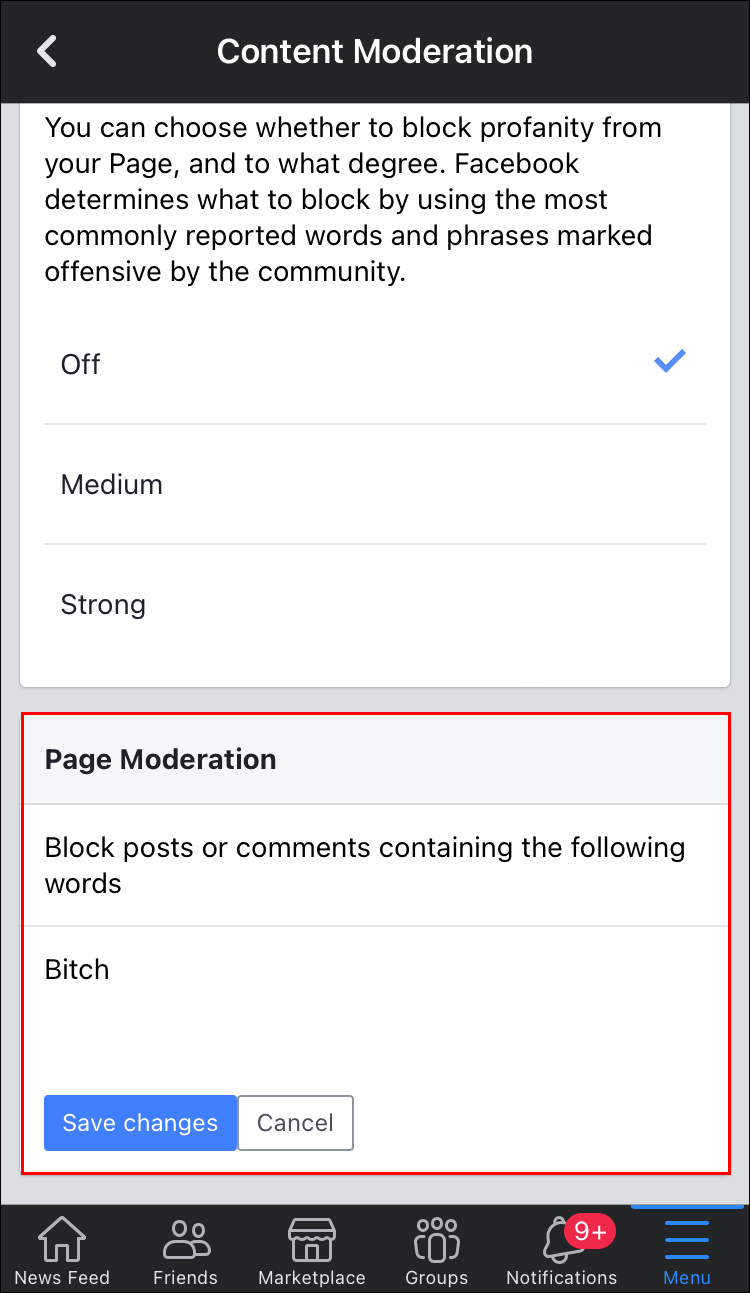 - Under “Page Moderation,” delete any word or phrase you don’t want Facebook’s algorithms to hide, then click “Save changes.”