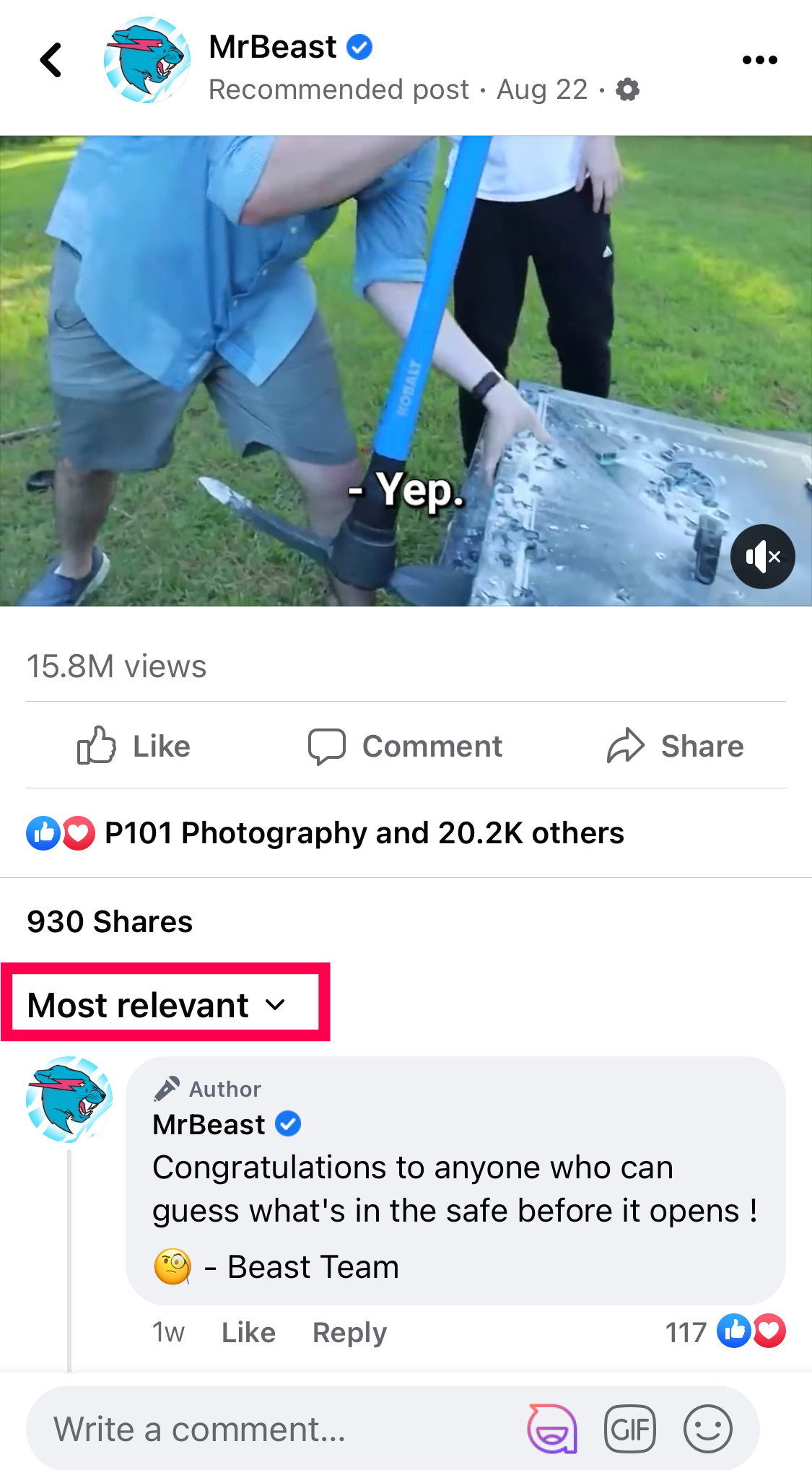 - Click on the “down arrow” in the bottom right of the post, right below the “Share” button. This will open the comment ranking dropdown menu, which is automatically set to “Most Relevant.”