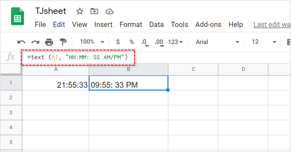 If you have a military time format in your spreadsheet, how do you convert it to standard time? Let’s use an example – if you have the time 21:55:33 in cell A1 and want to turn it to the 12-hour format, here’s what you do: