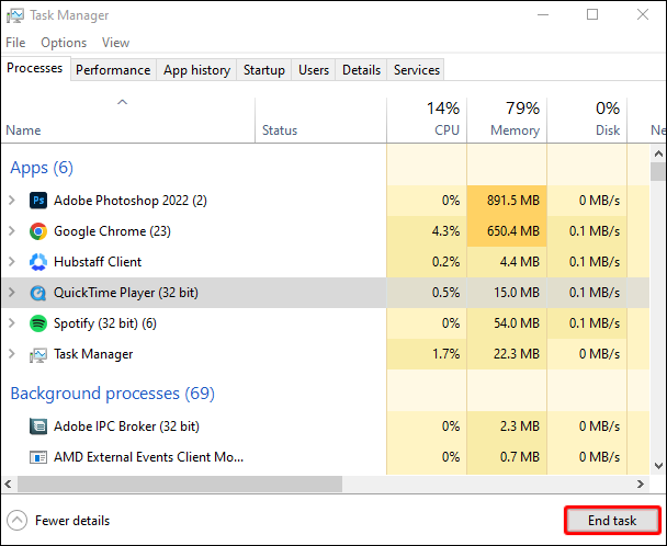 - Navigate to the “Processes” tab and find the program you want to force-quit (QuickTime).