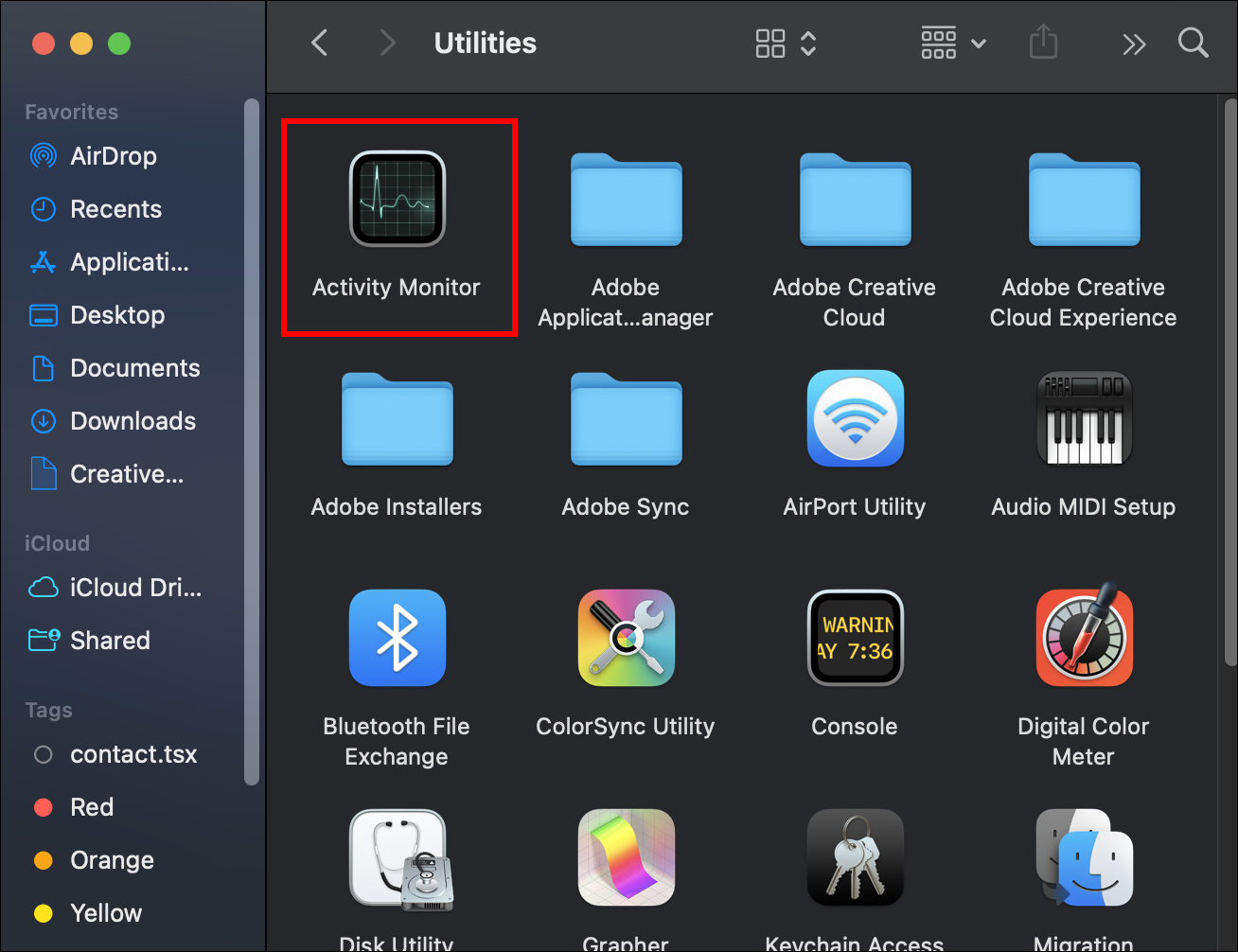 - Choose “Activity Monitor.” If you can’t find this utility, use Spotlight Search.