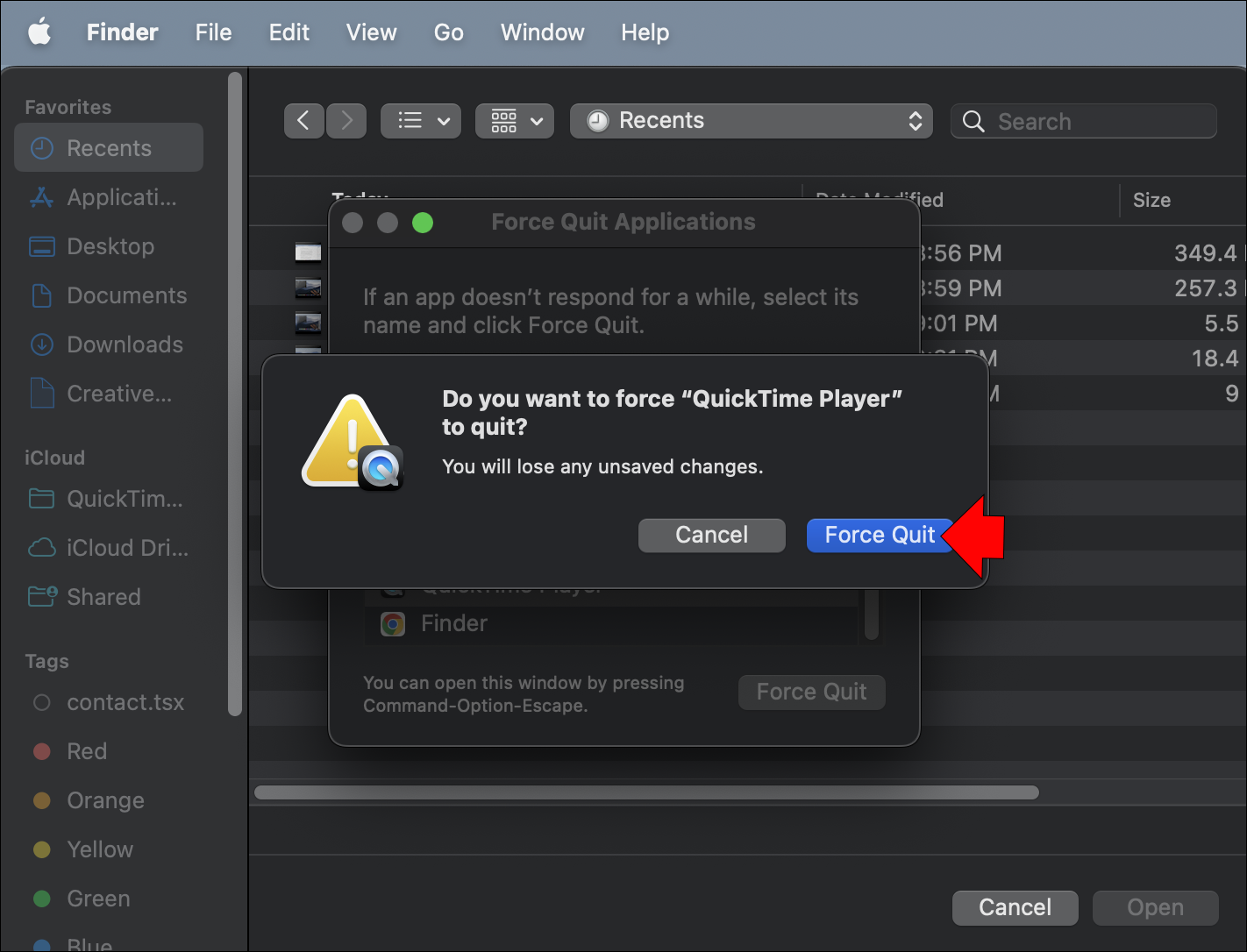 The above solution works great in most situations. However, QuickTime may not always work correctly on your device. The app is prone to freezing, making it unresponsive to your commands. In this case, you might need to force-quit the application.